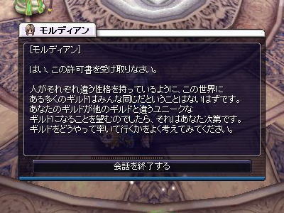 その後、もう一度ギルド協会事務所長に話しかけてクエストを終了して、「ギルドに関する操作」を行いギルド名を決めて完了です。